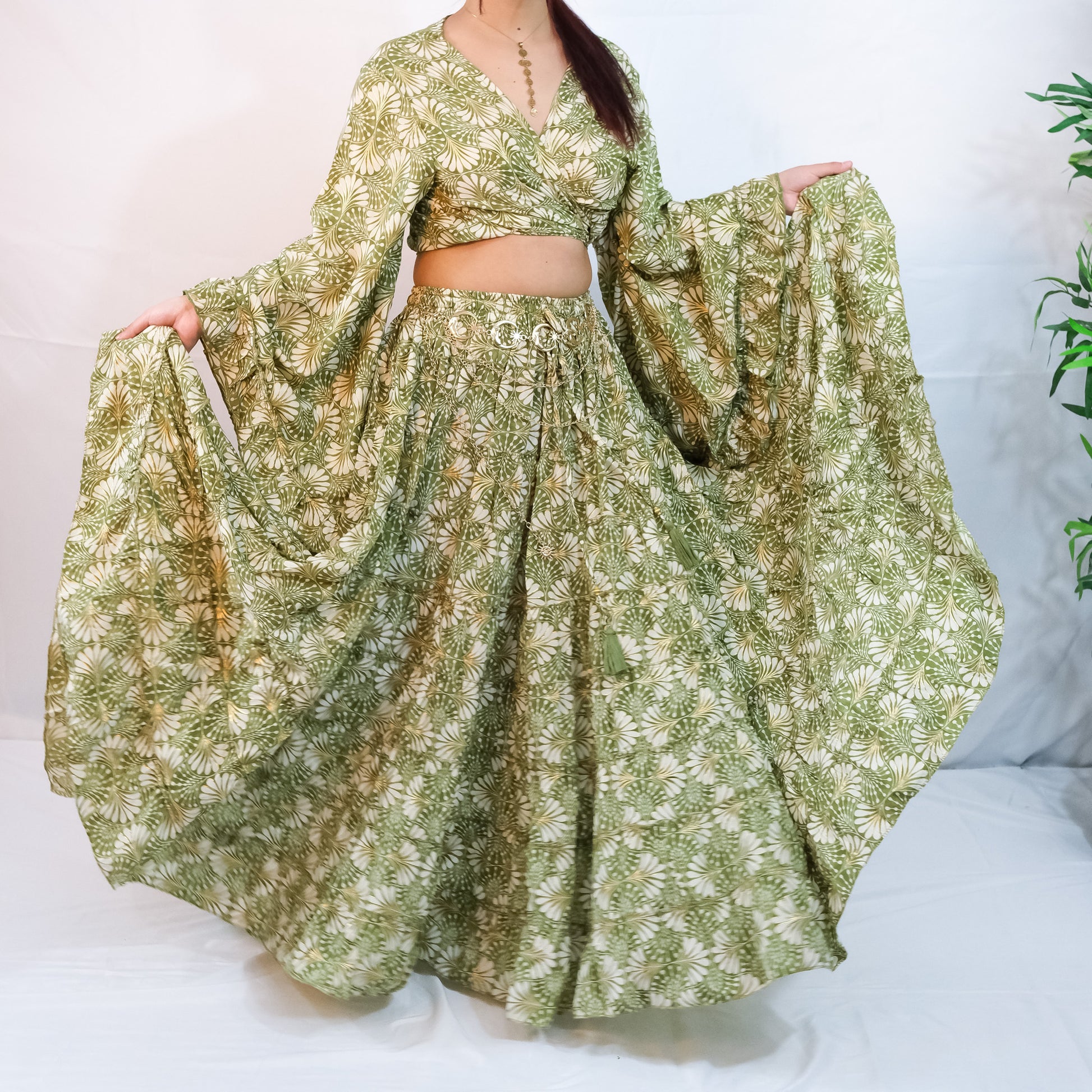 Indulge in the whimsical whimsy of our handmade Willow Whisper Skirt paired with a flowy tiered design and ruffle sleeve top. Embellished with delicate gold details, this boho and nature inspired outfit is perfect for fairy core and cottage core enthusiasts. Its long maxi length is ideal for summer and ren fair events. Embrace the bohemian hippie vibes with this unique and enchanting ensemble.