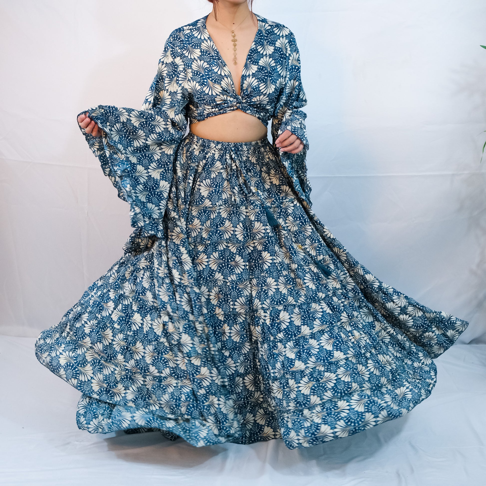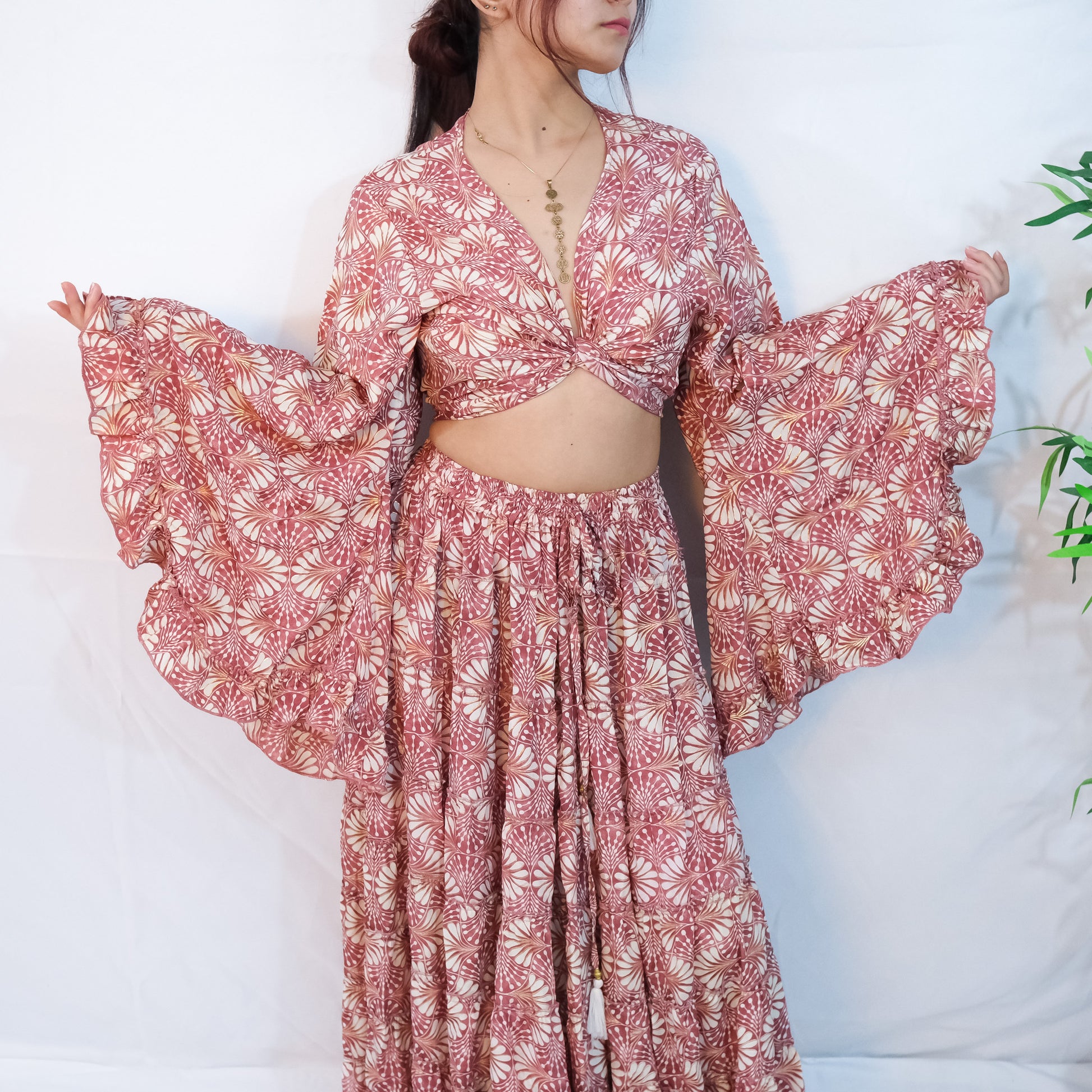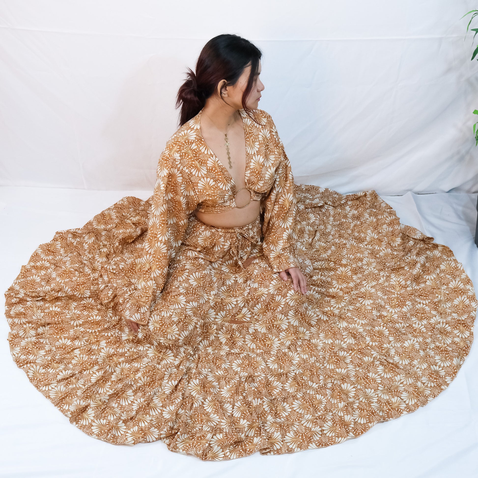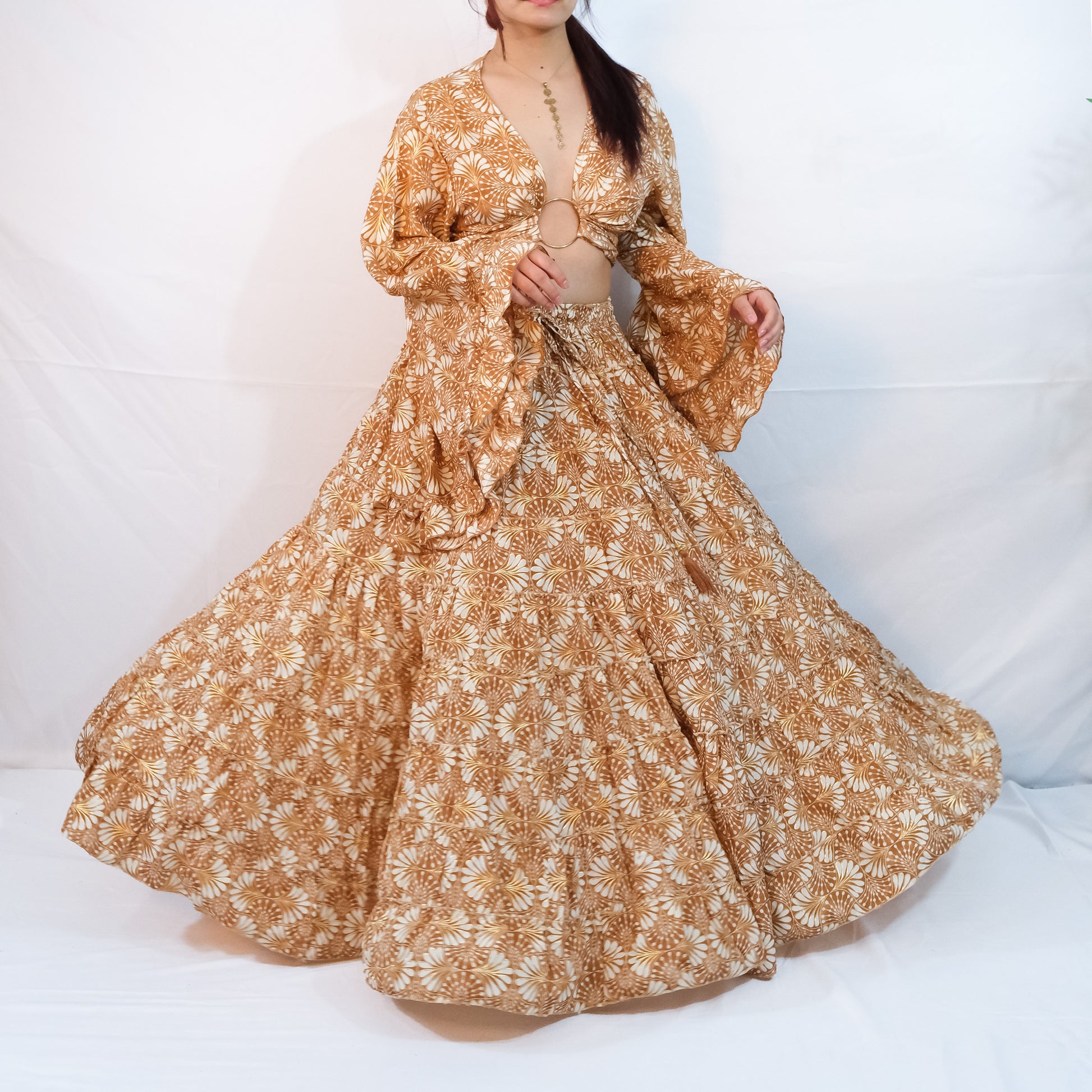 Indulge in the whimsical whimsy of our handmade Willow Whisper Skirt paired with a flowy tiered design and ruffle sleeve top. Embellished with delicate gold details, this boho and nature inspired outfit is perfect for fairy core and cottage core enthusiasts. Its long maxi length is ideal for summer and ren fair events. Embrace the bohemian hippie vibes with this unique and enchanting ensemble.