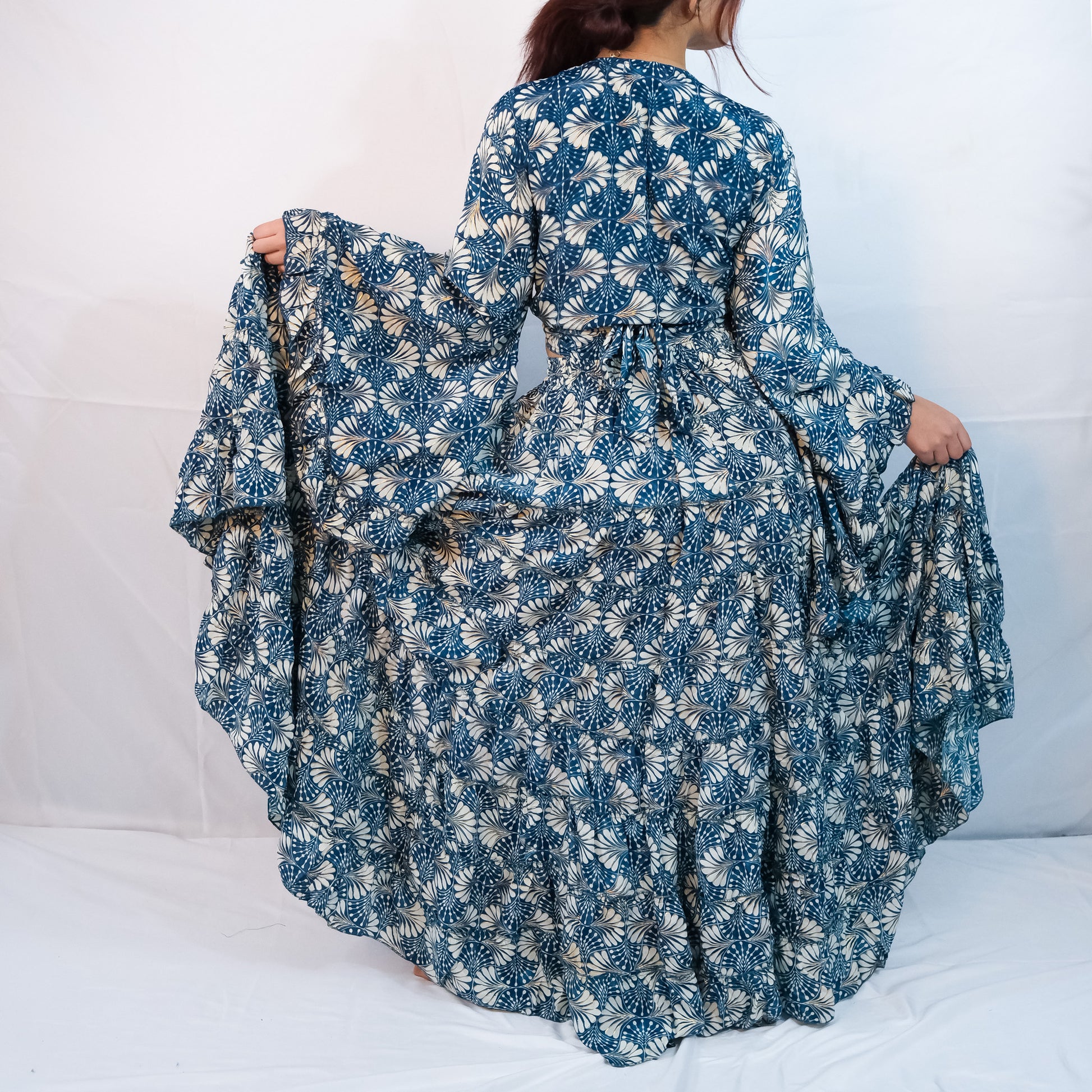 Boho Long Ruffle Recycled Silk Skirt and Tie Top Set