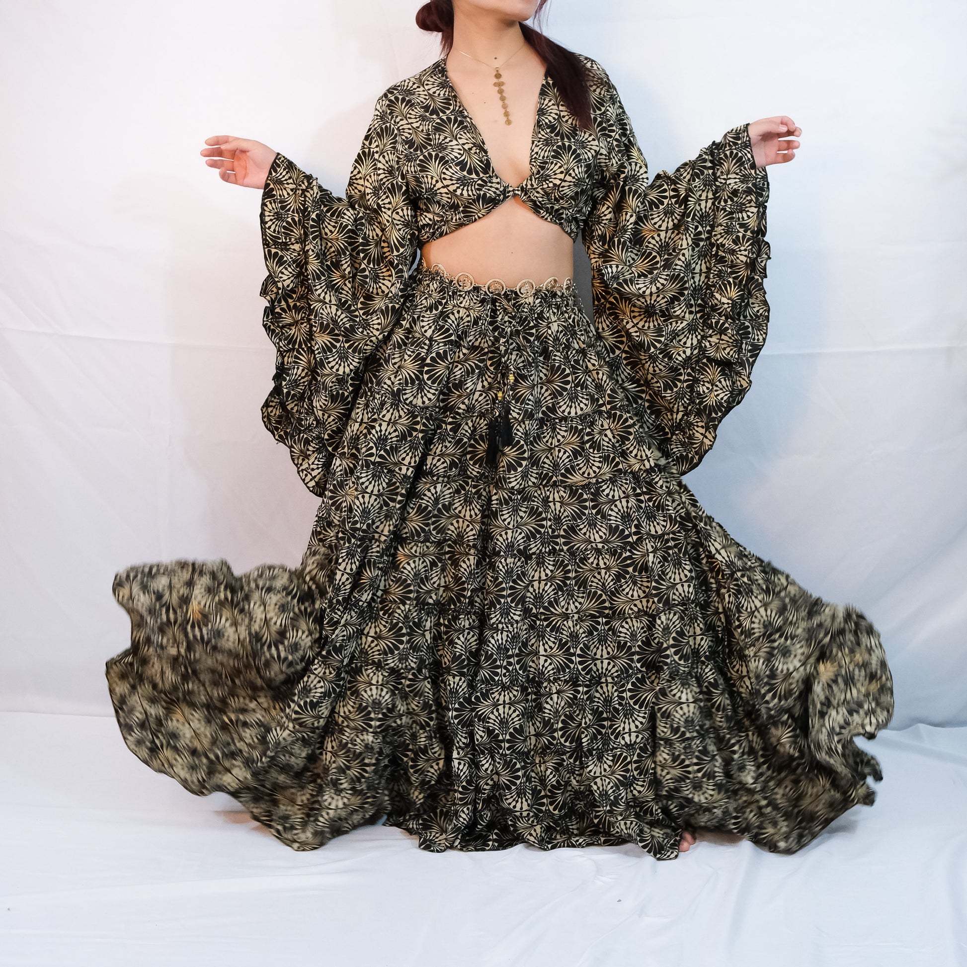 Indulge in the whimsical whimsy of our handmade Willow Whisper Skirt paired with a flowy tiered design and ruffle sleeve top. Embellished with delicate gold details, this boho and nature inspired outfit is perfect for fairy core and cottage core enthusiasts. Its long maxi length is ideal for summer and ren fair events. Embrace the bohemian hippie vibes with this unique and enchanting ensemble.