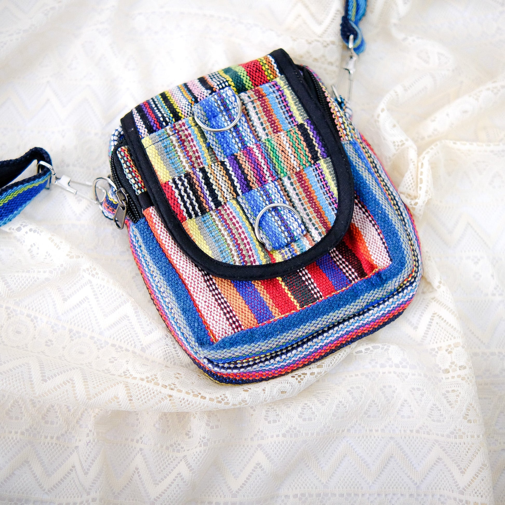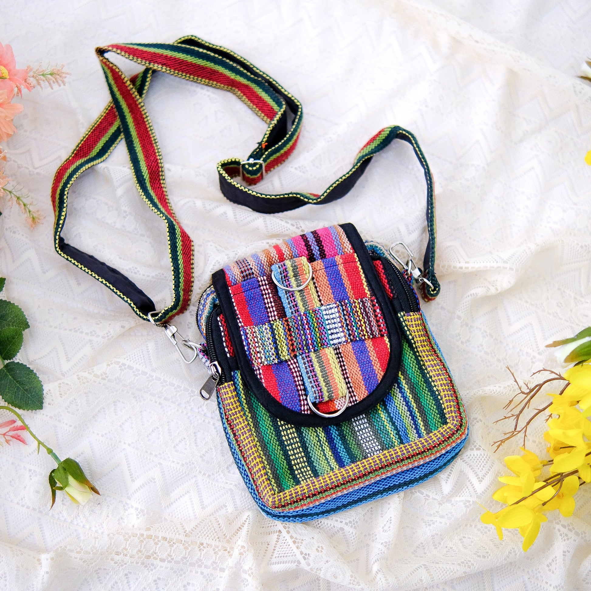 This multicolor crossbody bag is handmade with eco-friendly materials, making it the perfect choice for those who value sustainability. Its boho style and unisex design make it a versatile and fashionable accessory for any occasion. Made from soft cotton, this hippie shoulder bag is a must-have for any conscious consumer.