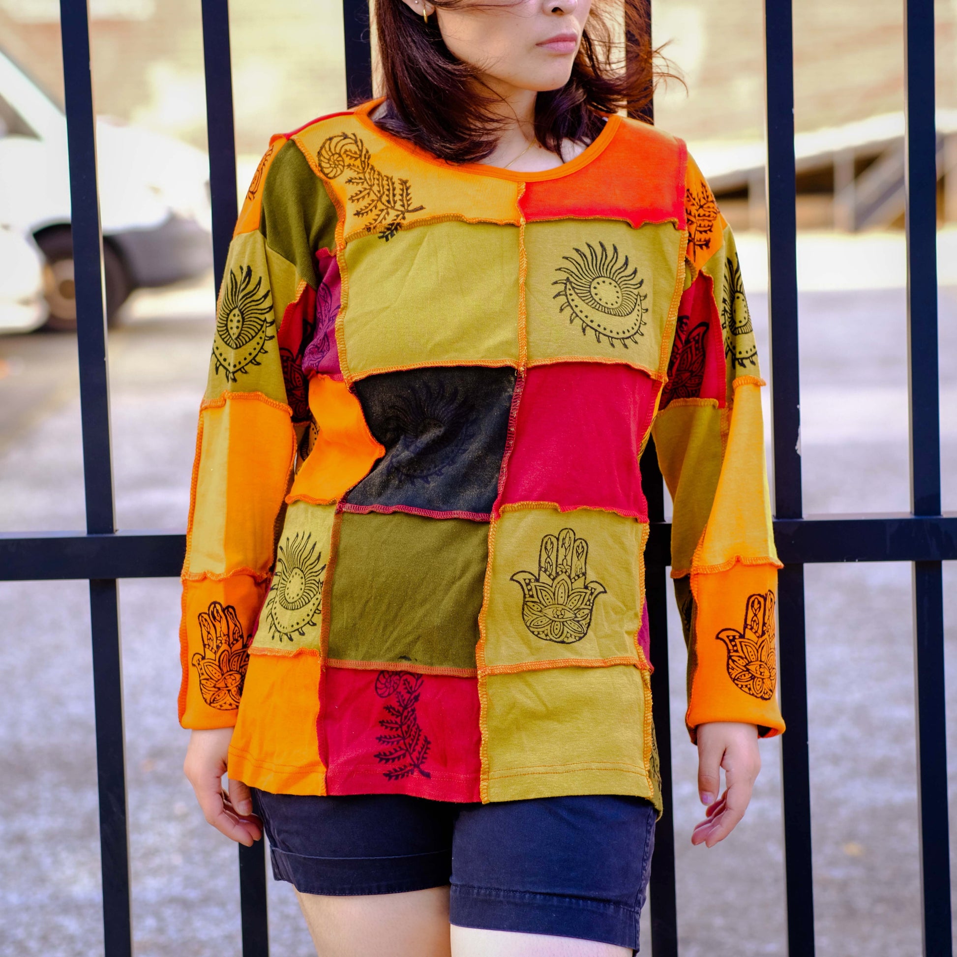 This stylish, handmade patchwork sweater features a celestial print in bright and colorful hues. Constructed with 100% cotton, this unisex sweater is perfect for boho and festival styles and offers a retro 90s look.