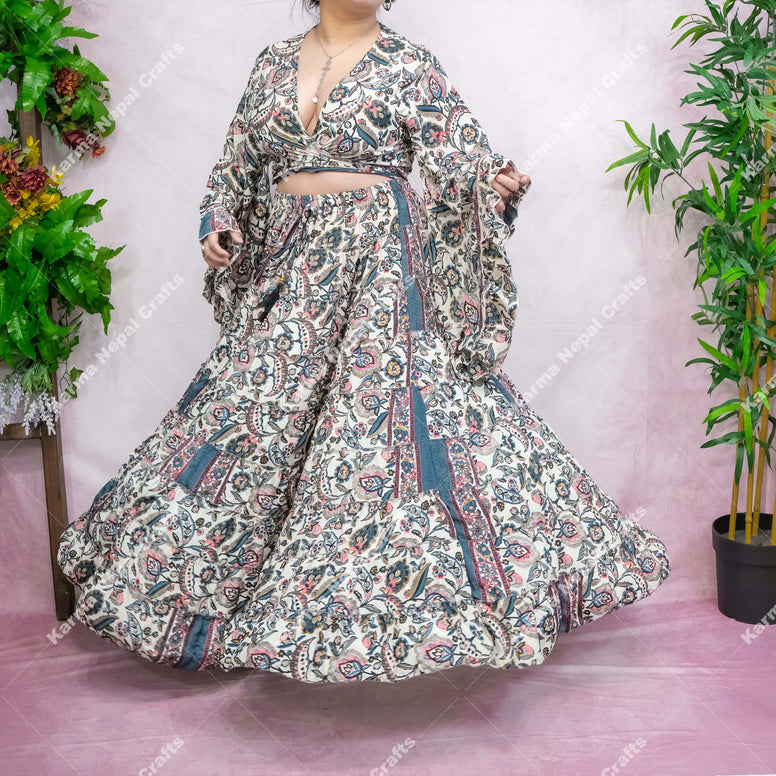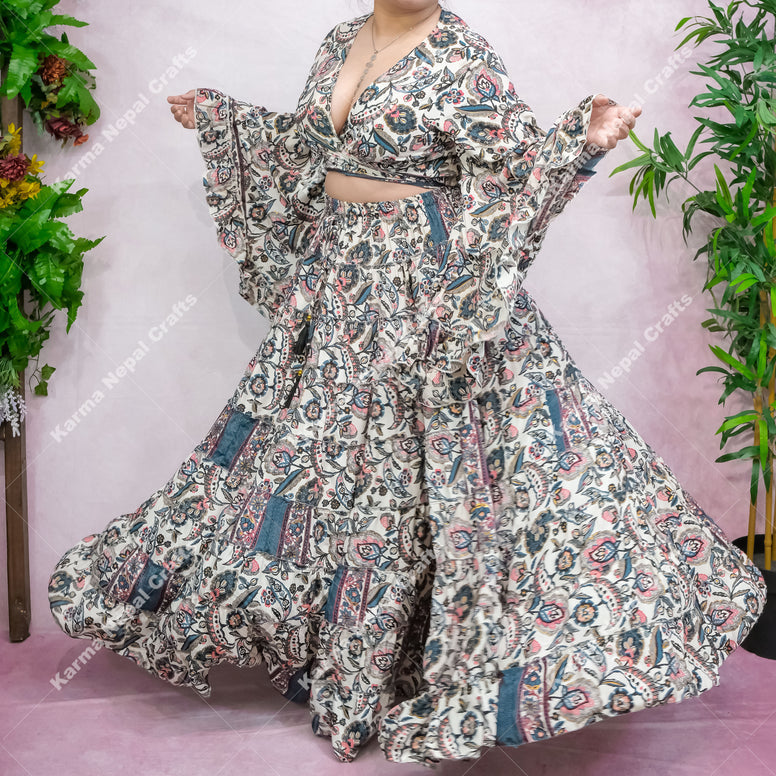 This skirt set has the print of celestial and floral that has been handmade with the touch of gold glitter that makes it more unique...