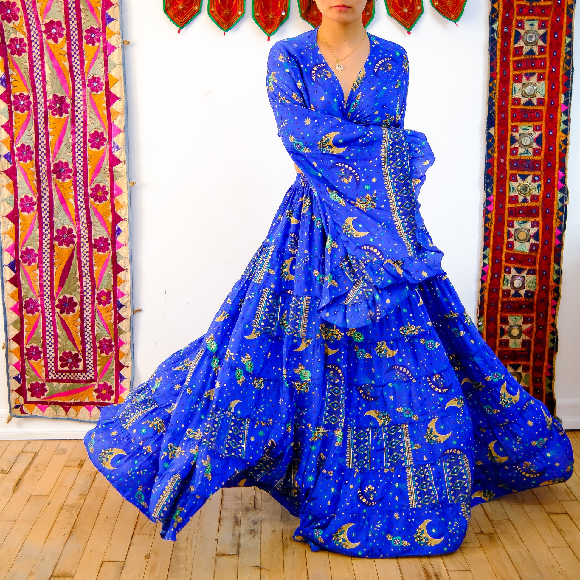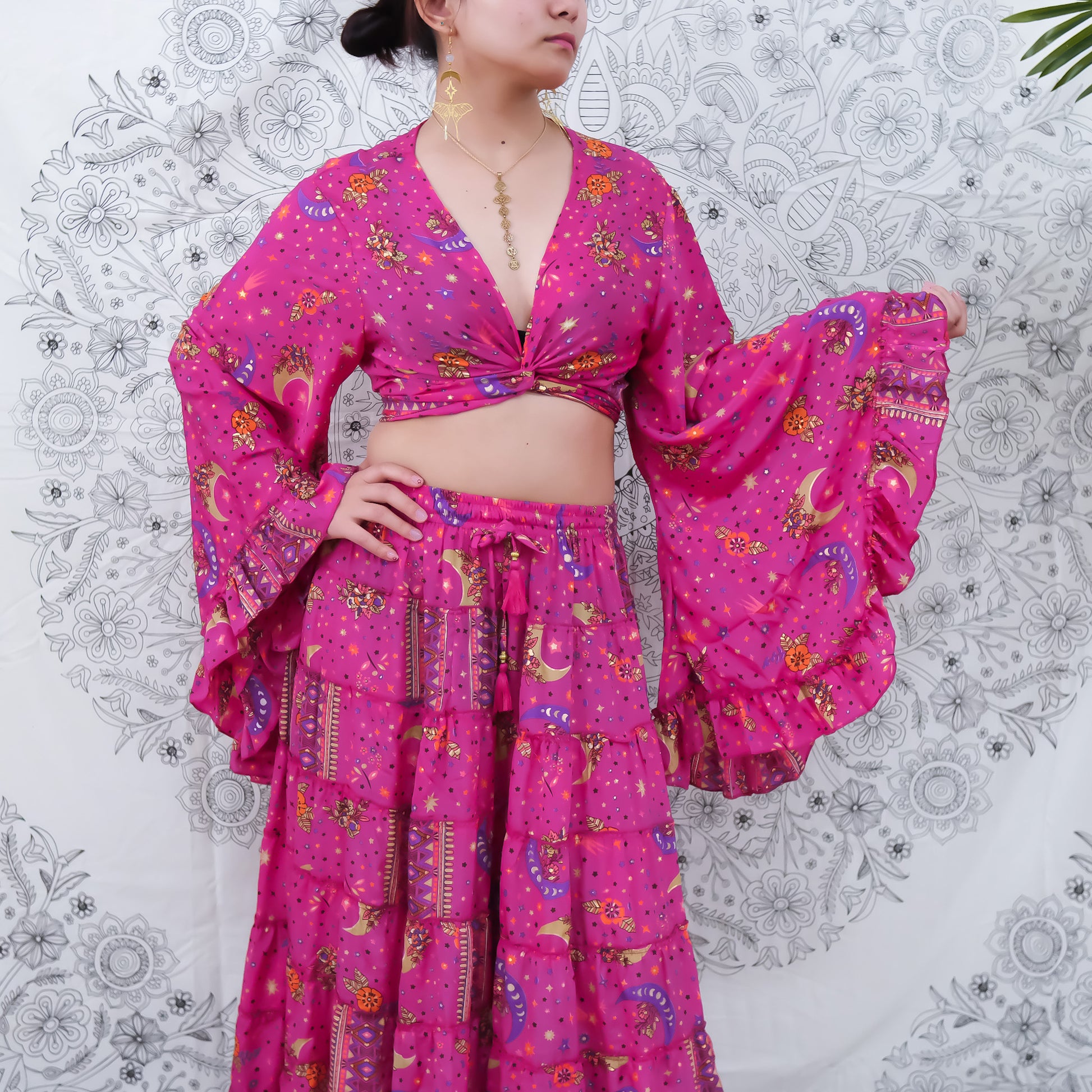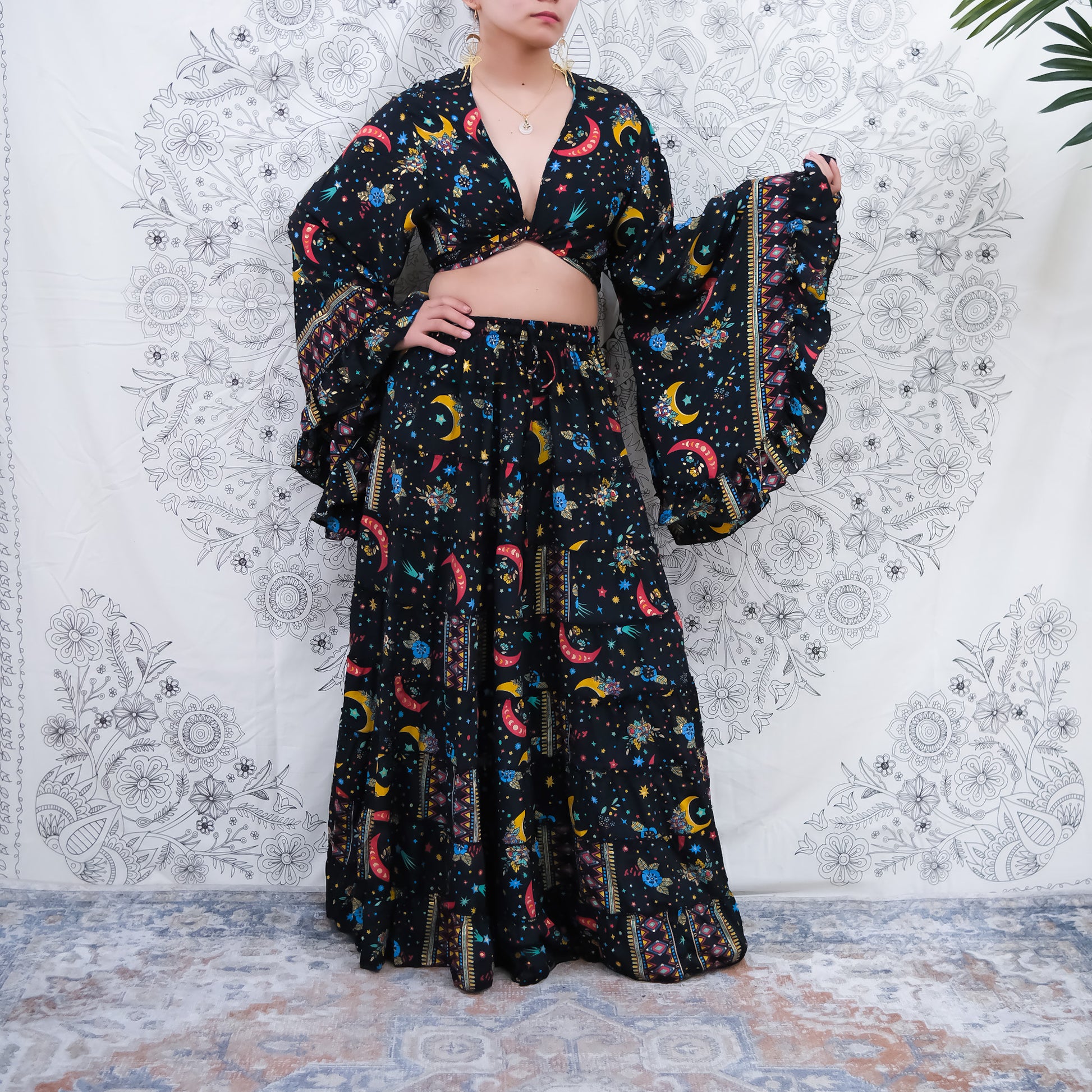 This skirt set has the print of celestial and floral that has been handmade with the touch of  gold glitter that makes it more unique...