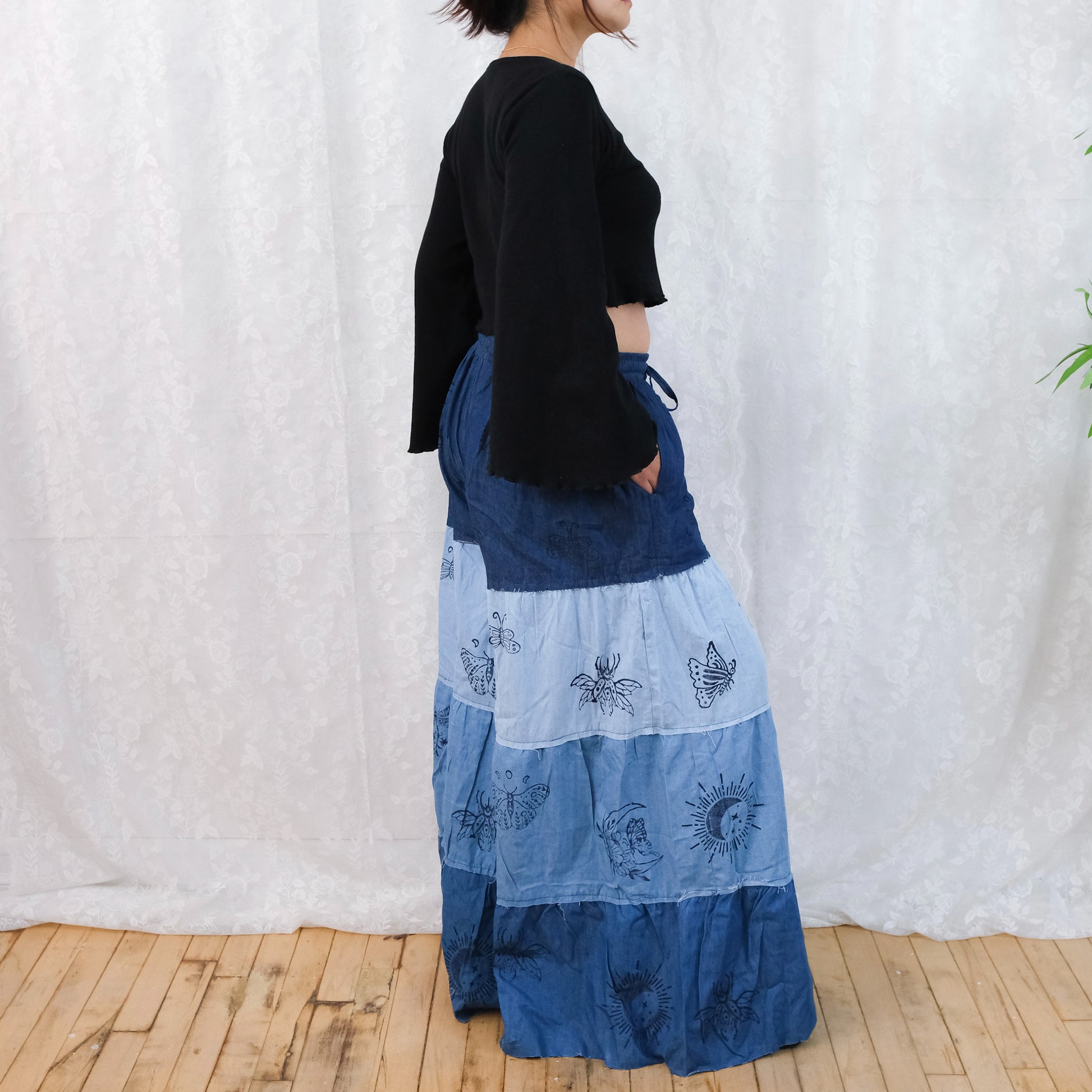 Introducing our Denim Tiered Wide Leg Pants - handmade with 100% cotton denim for a comfortable and durable fit. The elastic waist features a drawstring for adjustable comfort. Embrace boho hippie vibes with the block print of celestial, butterfly, and moth designs. Perfect for a bohemian style with earth tone colors.