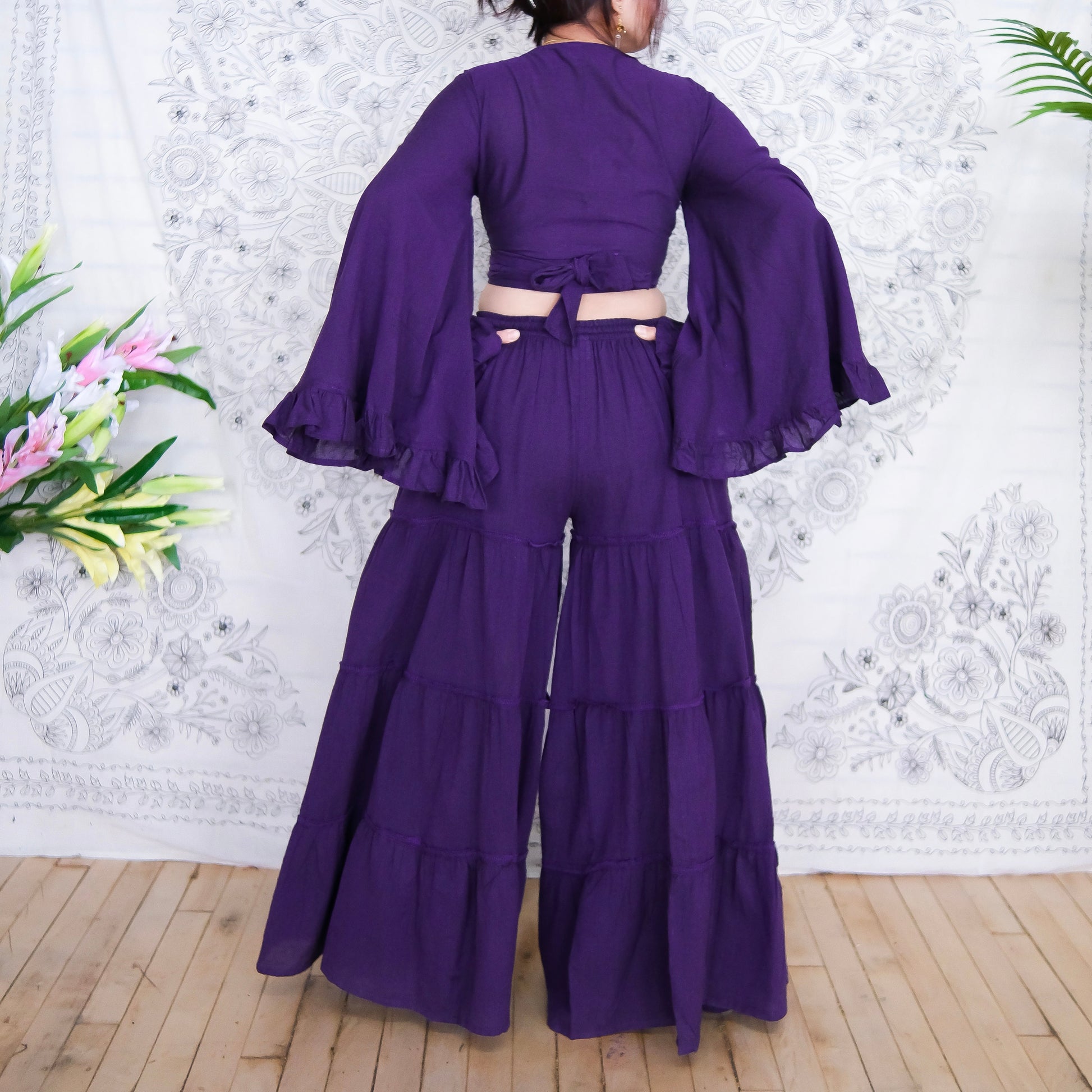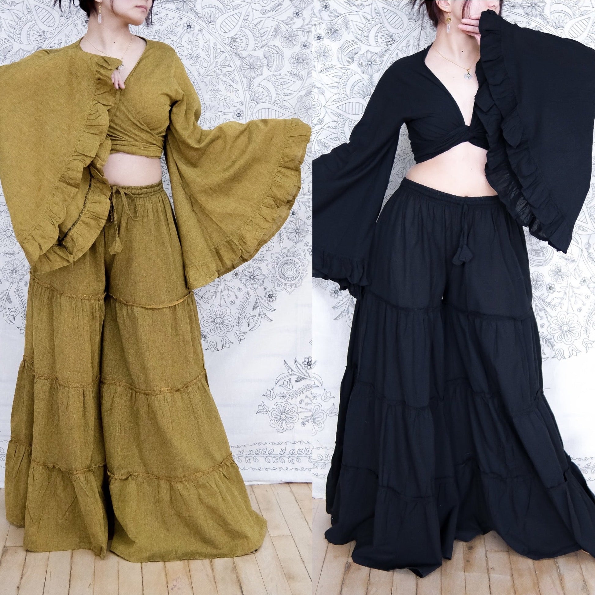 Elevate your wardrobe with our Flowy Tiered Cotton Pants. These handmade pants feature a wide leg design for a free-spirited, boho look. Paired with our ruffle sleeve top, this two piece set embodies a 90s-inspired, hippie aesthetic. Made for all sizes, these plus size inclusive pants bring a flowy, yoga-inspired feel to your style.