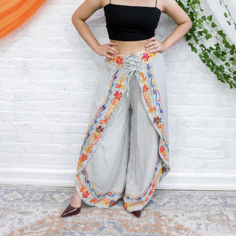 Elevate your style with our Embroidery Wide Leg Slit Pants. Handmade with intricate embroidered details, these flowy wide leg pants are perfect for any occasion. The elastic waistband ensures a comfortable fit, while the boho and hippie style add a unique touch to your wardrobe. Perfect for yoga or a casual day out.