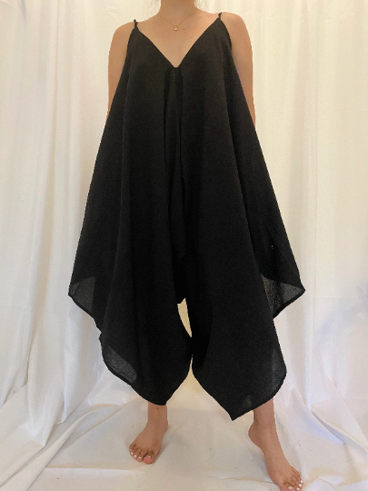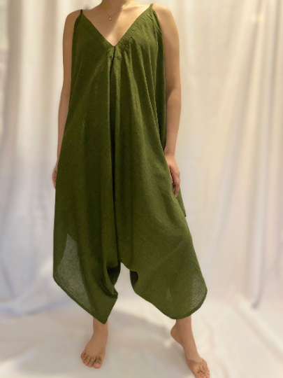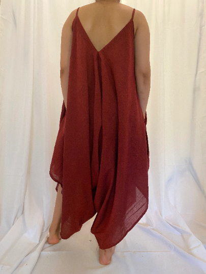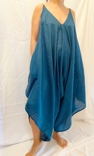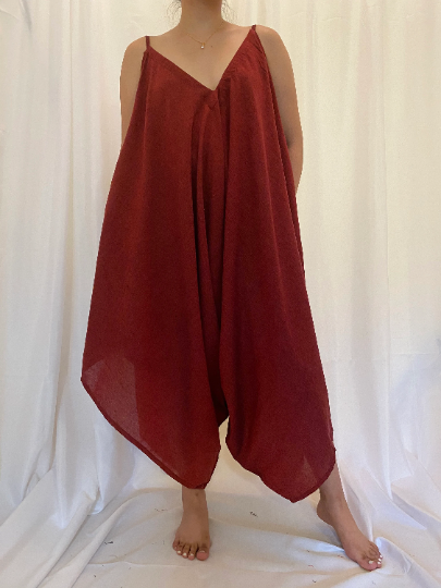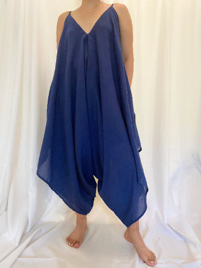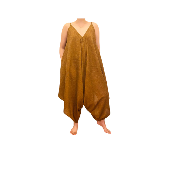 This handmade organic cotton jumpsuit will be your go-to item for a stylish and comfortable look. Featuring a bohemian-style design with a wide-leg harem fit and plus size fit, you'll have the perfect look for a weekend getaway, beach cover-up or just to lounge. Its quality organic cotton fabric ensures a breathable, lightweight feel that you won't be able to resist.