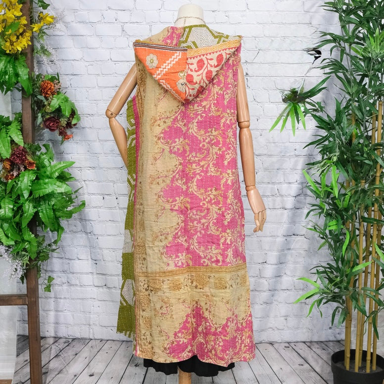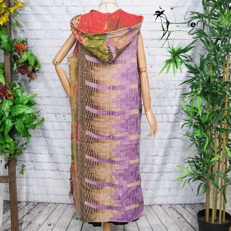 Discover the charm of the 90s with this handmade vintage upcycled fashion piece, the Bohemian Kantha Open Jacket with Hoodies. This unique accessory is crafted from upcycled materials, making it a sustainable choice for your wardrobe.