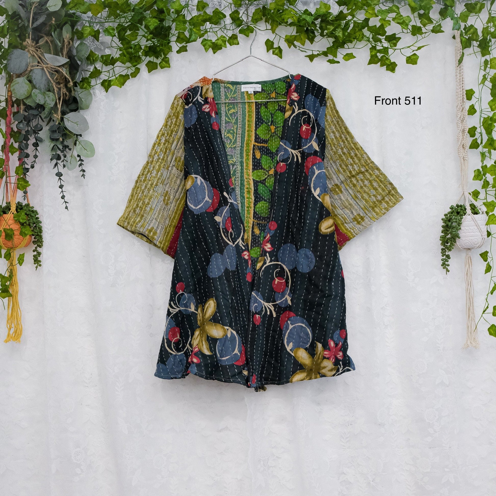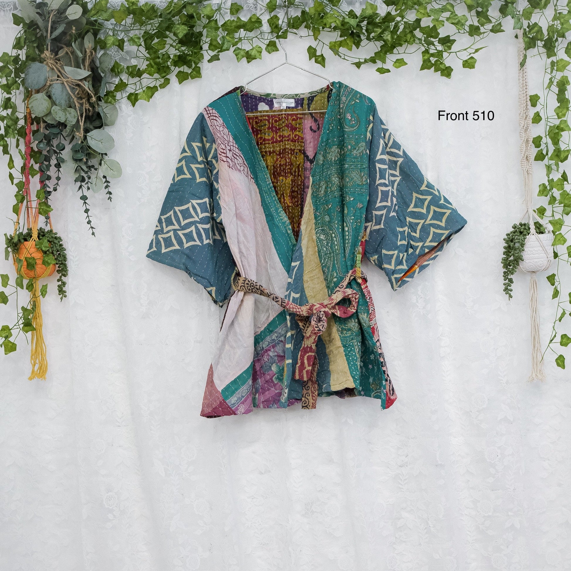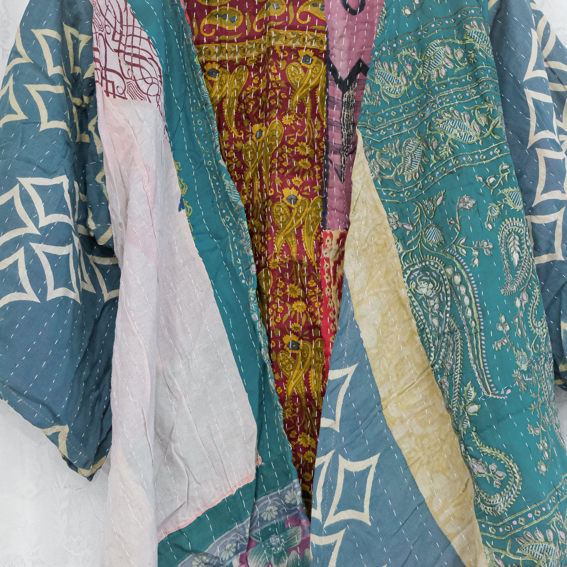 Handcrafted from upcycled vintage fabrics, the Kantha Short Kimono is a sustainable fashion statement. With its loose, unisex design and bohemian, hippie style, this kimono is perfect for those seeking a unique and environmentally-friendly addition to their wardrobe. Each kimono is handmade and hand-stitched, making it truly one-of-a-kind.