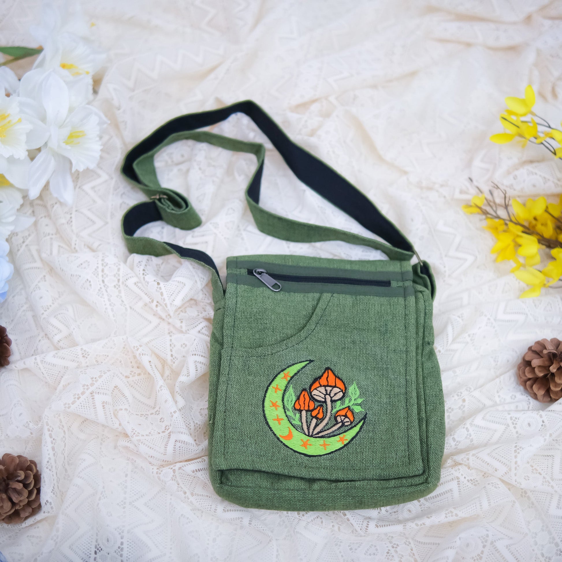 Expertly handcrafted, this Mushroom Celestial Cotton Side Bag features a unique, hand-embroidered design that adds a touch of bohemian charm. With its multiple compartments, this unisex satchel bag is perfect for keeping all your essentials organized. Make a statement with this psychedelic bag that is both functional and stylish.