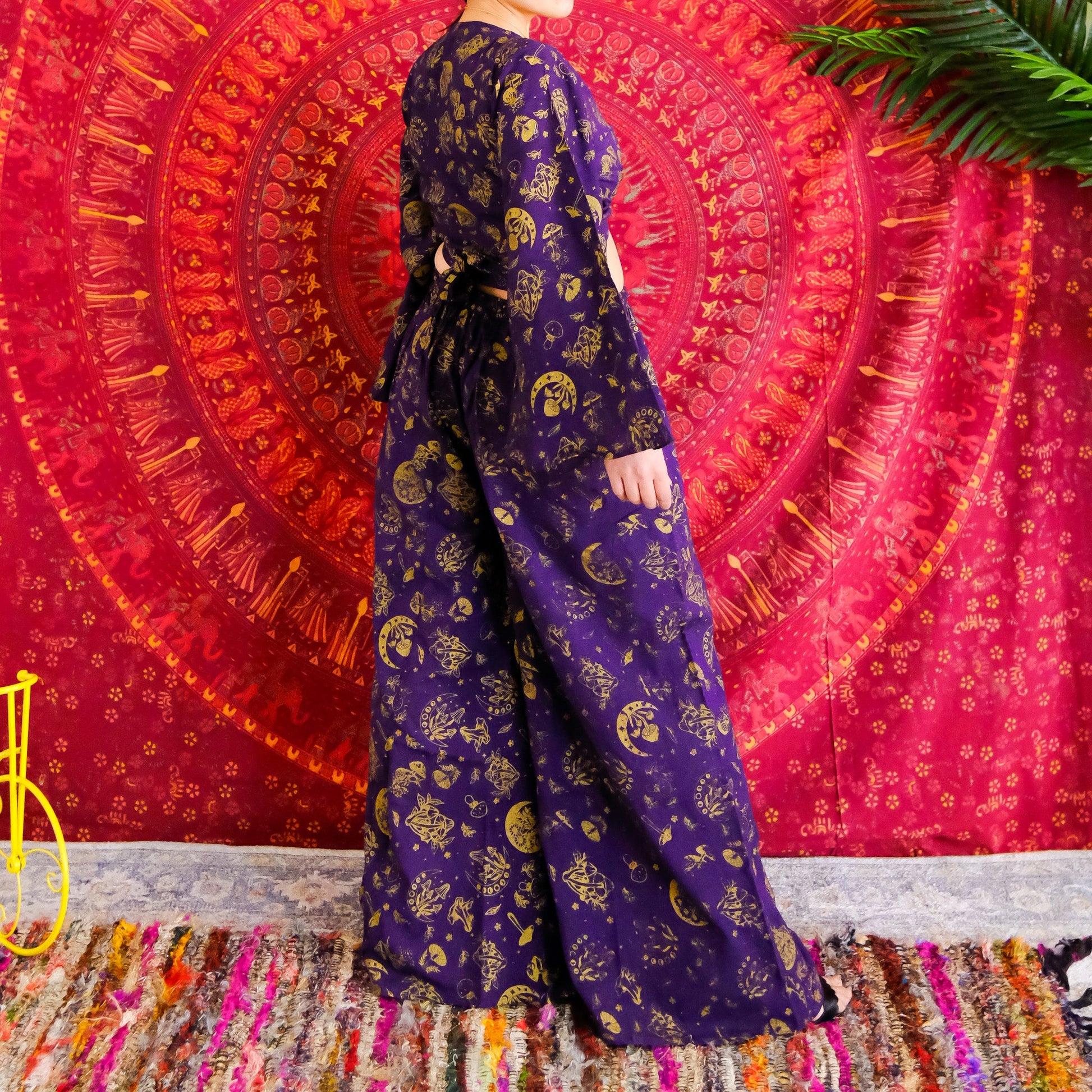 This Mushroom Print Whimsy Boho Hippie Two Piece Pant + Tie Top Set is handcrafted for a whimsical free spirit style. Made with lightweight cotton, it features a flowy wide leg design and flare sleeve top, perfect for a bohemian summer or all season fit. Its celestial and mushroom prints add a touch of magic to this inclusive and trendy boho hippie outfit.