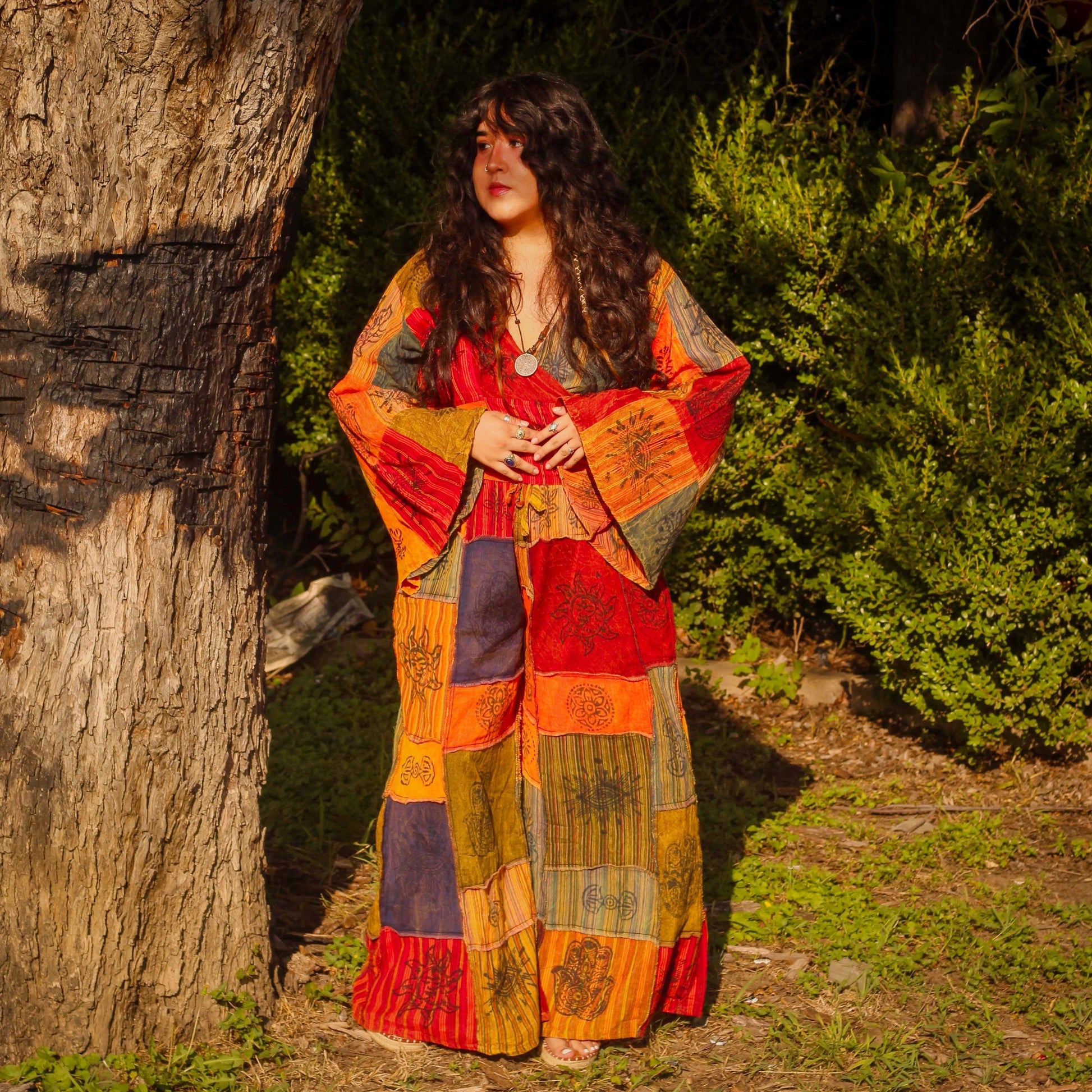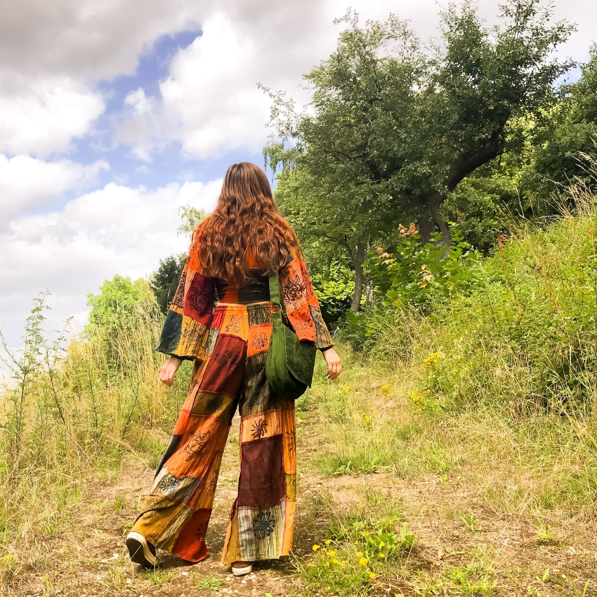 Express your sense of boho style with these handmade, patchwork palazzo wide-leg sets. Crafted from organic cotton for a breathable, festival-ready feel. These hippie-style trousers offer a comfortable style for any occasion.