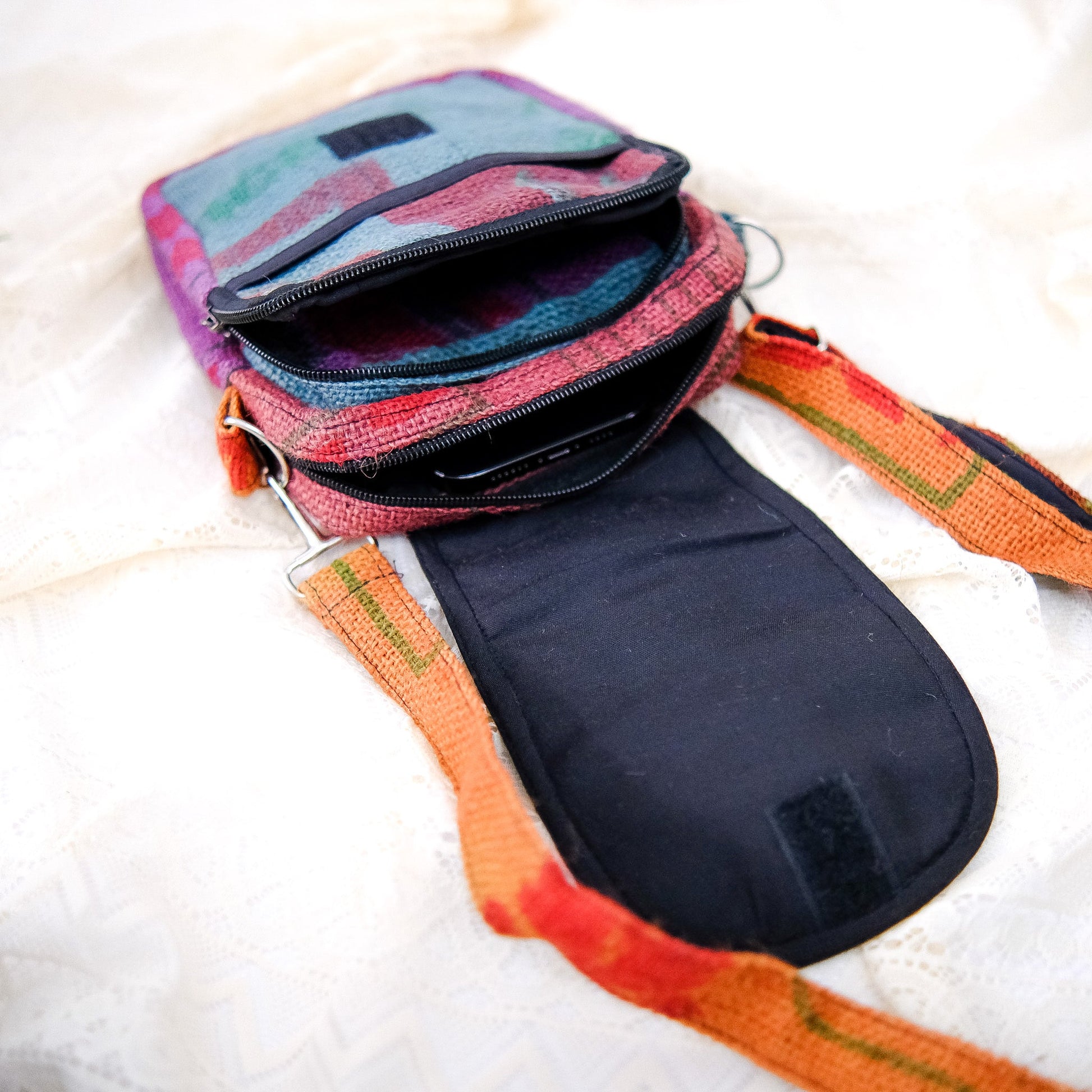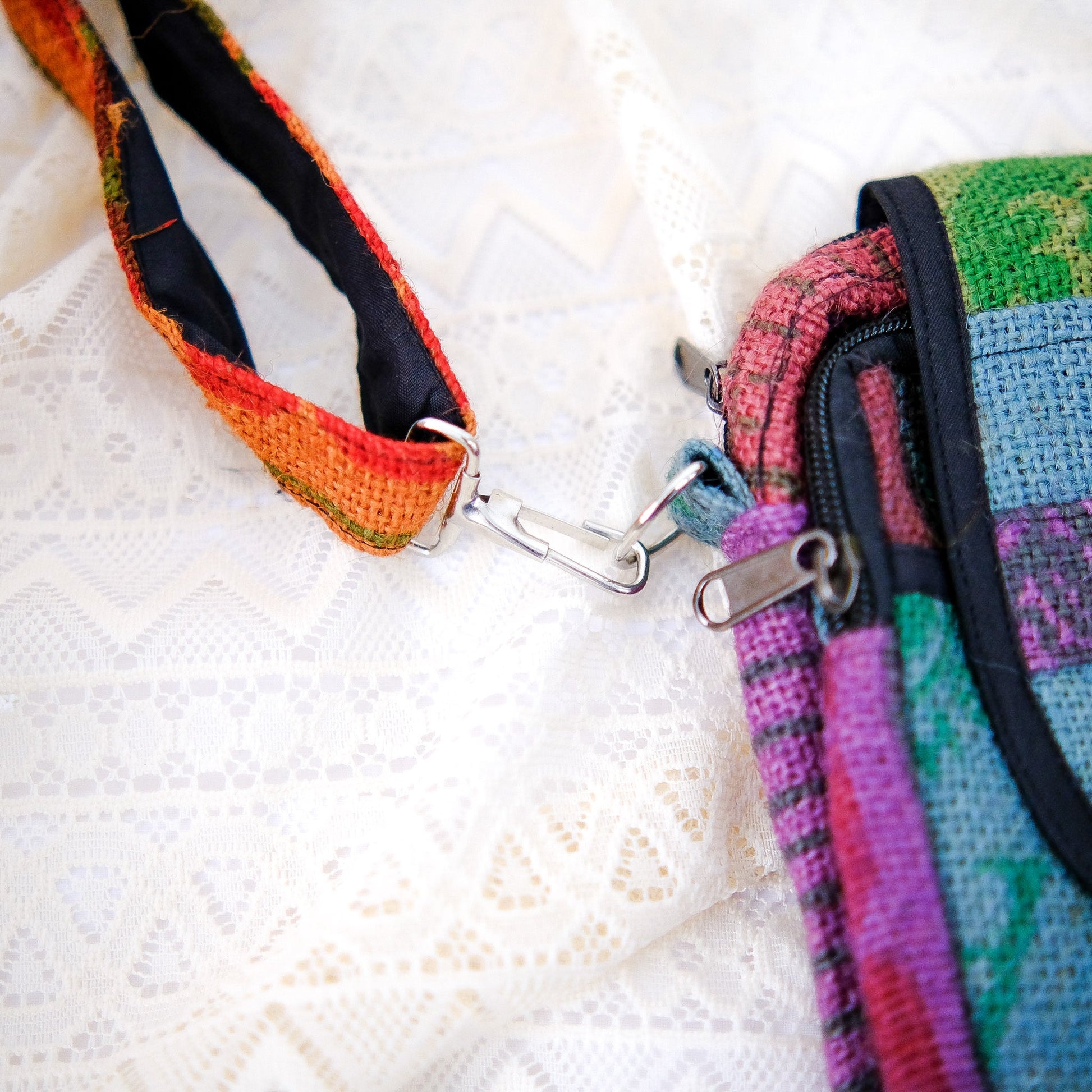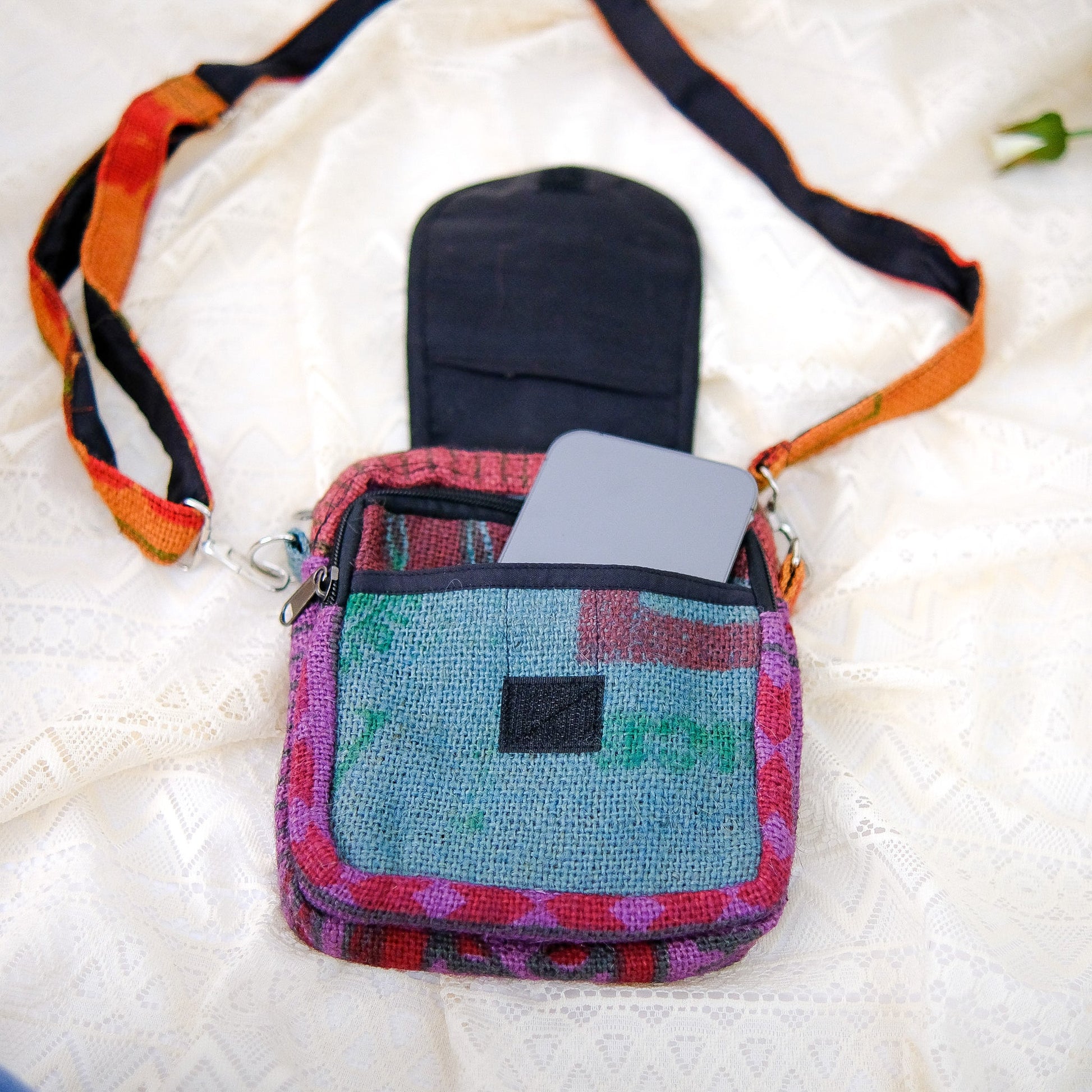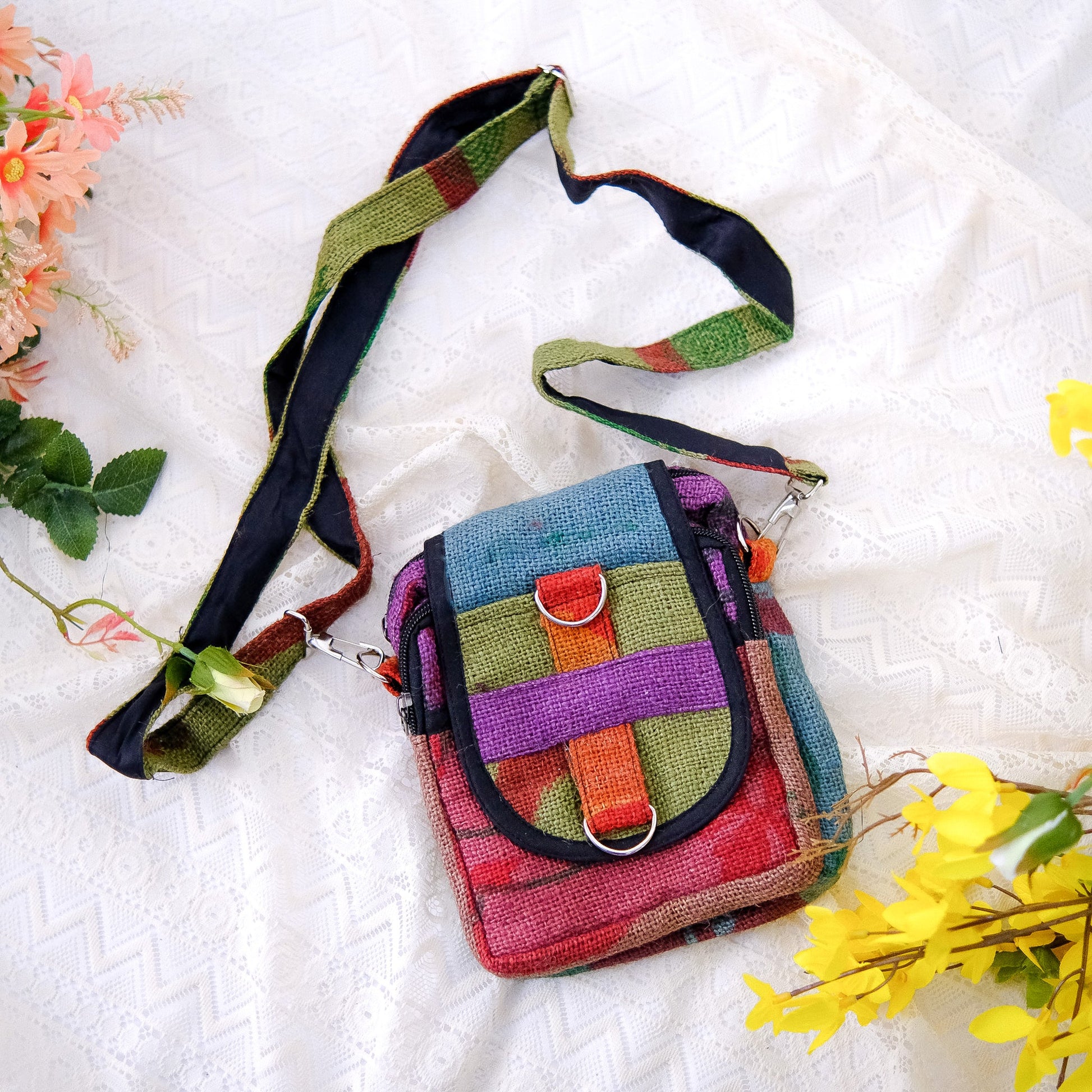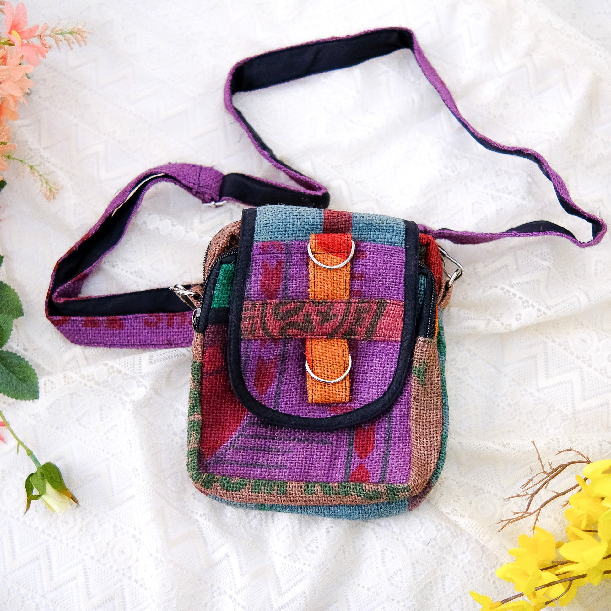 This crossbody bag is handmade from recycled jute, making it an eco-friendly choice. Its boho style and unisex design make it a versatile accessory. Help reduce waste and make a stylish statement with this Hippie-inspired bag.