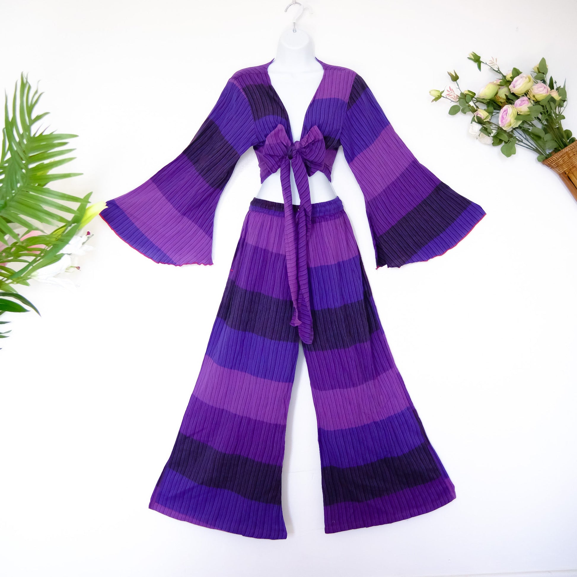 Introducing the Elanor Flowy Wide Leg Flare Pants with Bell Sleeve Top, a handmade two piece set perfect for both yoga and outings. These flowy, plus size inclusive pants feature a boho style inspired by 70s and 90s fashion. Made with cotton, these palazzo pants and bell sleeve top are perfect for summer festival and hippie fashion.