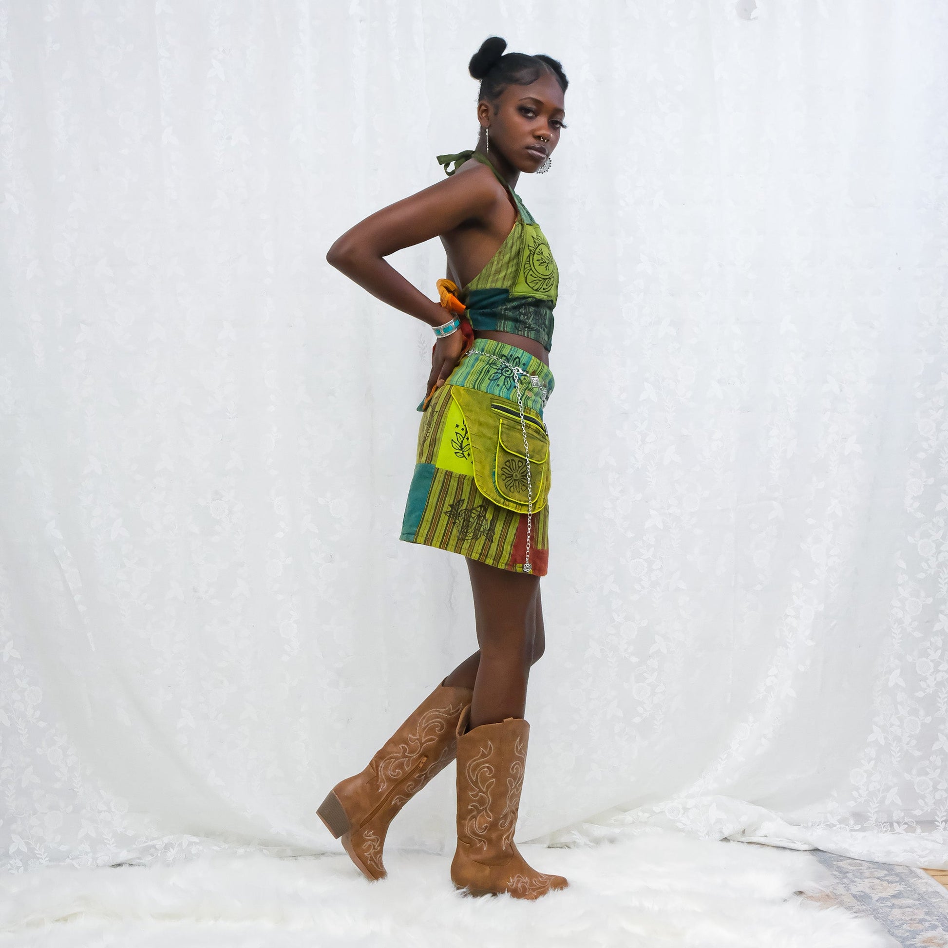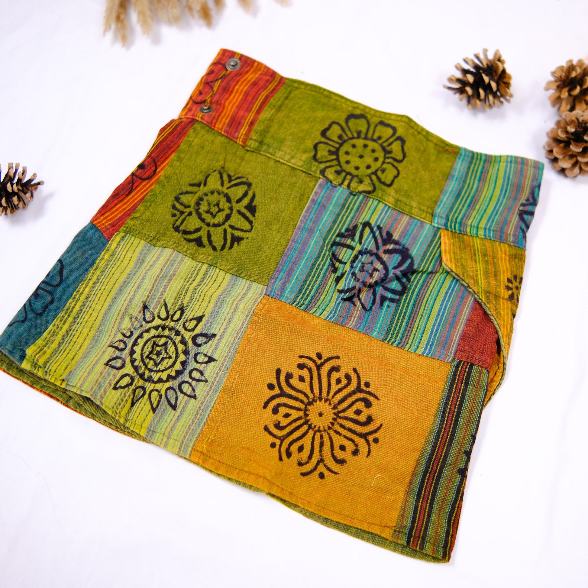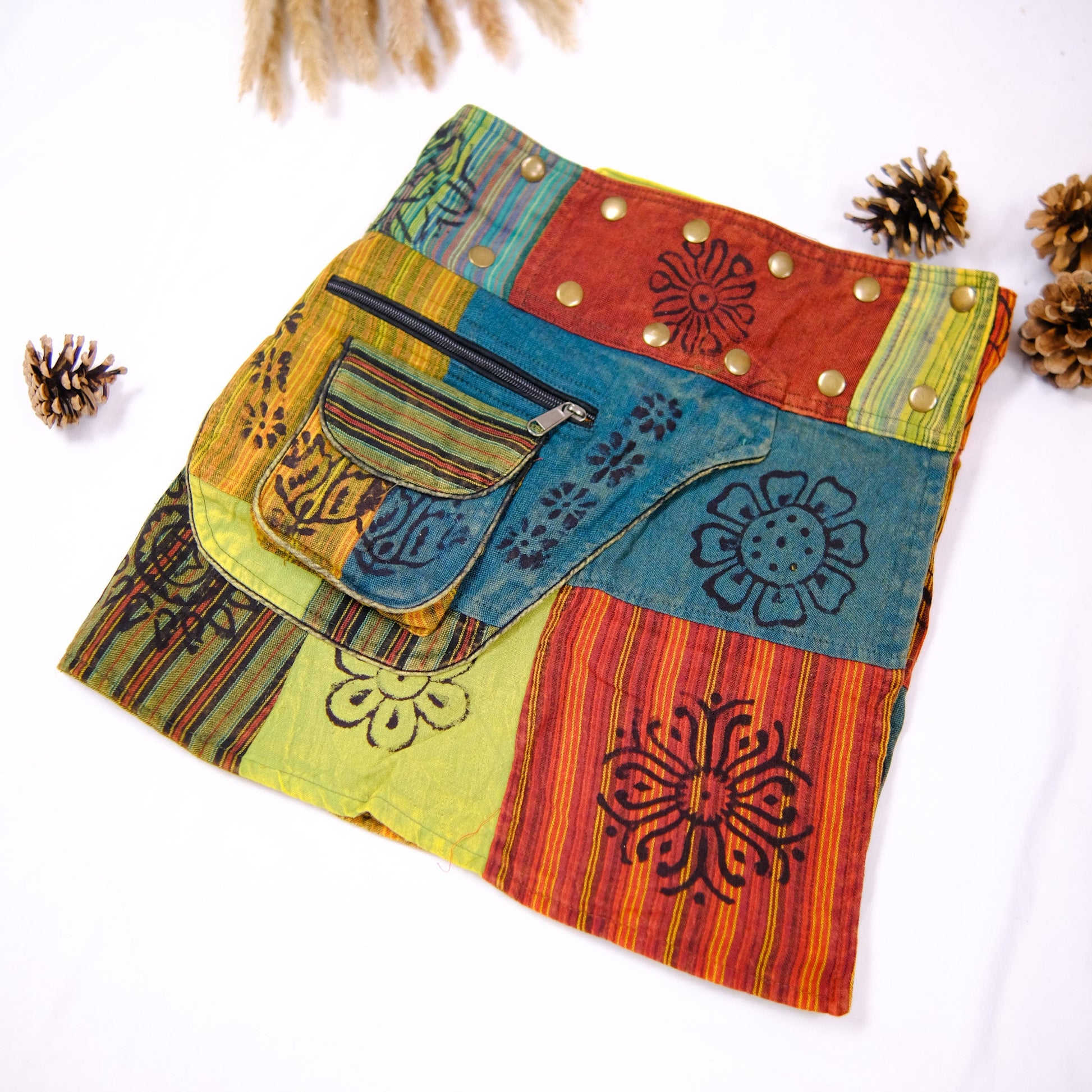 Add a touch of vintage charm to your wardrobe with our Hippie Skirt. This handmade cotton skirt features a patchwork design and adjustable waist with popper buttons, making it both stylish and comfortable to wear.