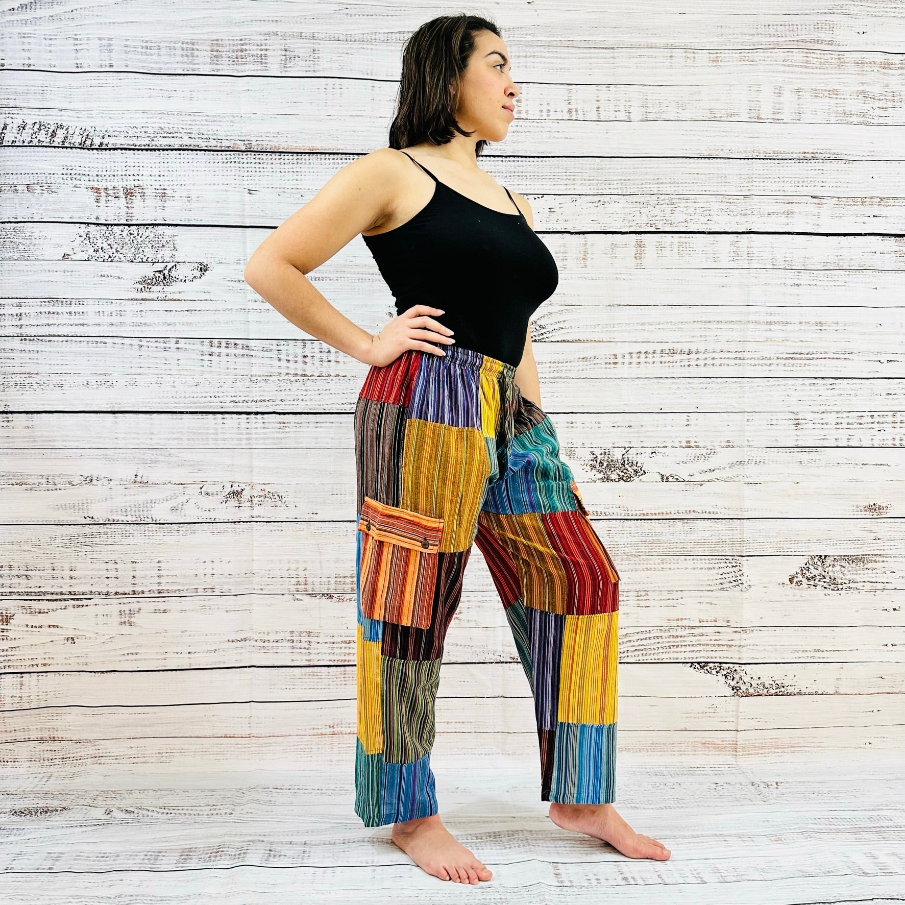 These unisex trousers boast an eye catching patchwork design and multiple pockets, making them the perfect combination of stylish and practical. Crafted from soft yet durable cotton fabric, these colorful, multi pocket palazzo pants are perfect for everyday wear.