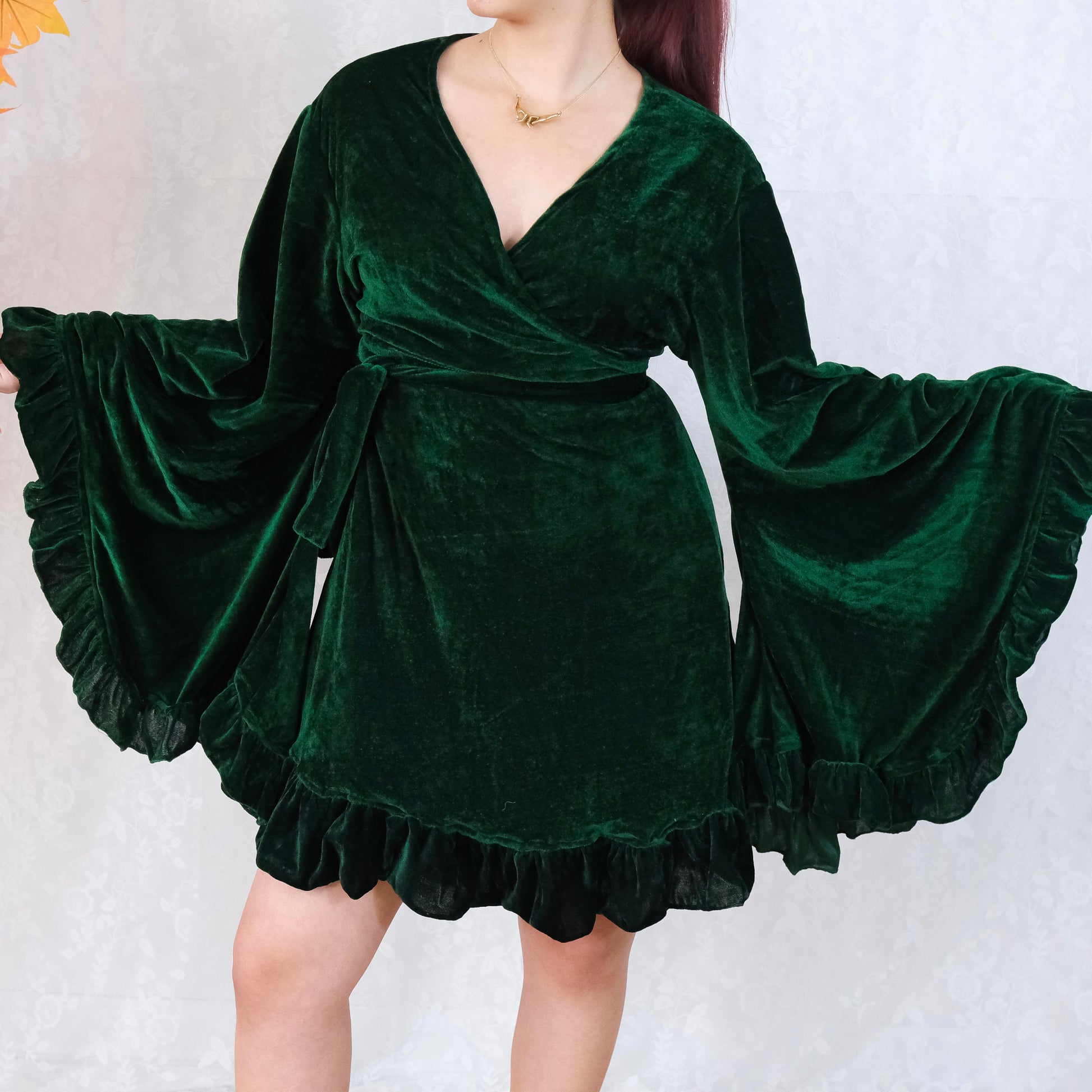 Crafted from velvet, this mini wrap dress exudes retro glamour with its whimsical ruffle sleeve and boho style. The stretchy fabric offers a comfortable and flattering fit, making it the perfect addition to your witchy outfit. Embrace the cute bohemian style of this dress for a trendy look.
