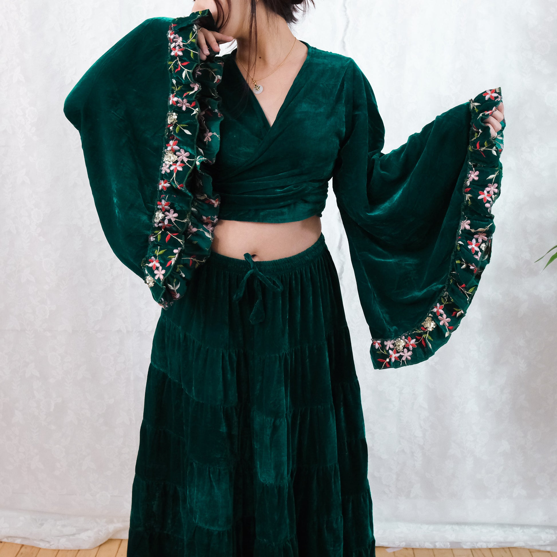 This handmade Velvet Whimsy Skirt Set features a ruffle sleeve top and stretchy elastic waist, creating a soft and fairy-like style. The hand embroidery on the sleeves and full bottom of the skirt adds a touch of whimsical and witchy fashion, perfect for those seeking cottage core vibes.