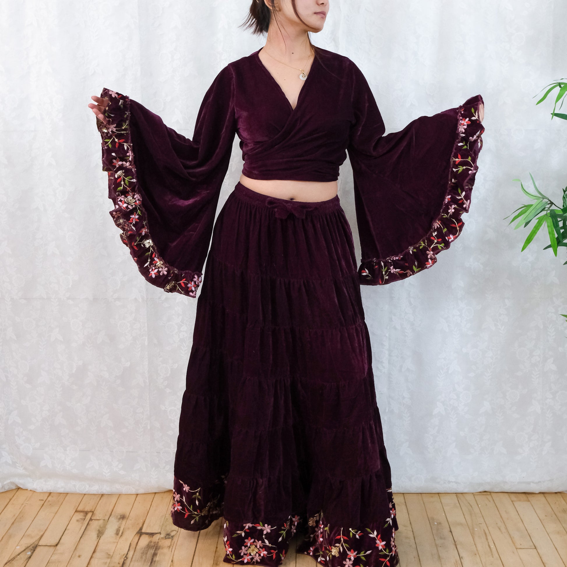 This handmade Velvet Whimsy Skirt Set features a ruffle sleeve top and stretchy elastic waist, creating a soft and fairy-like style. The hand embroidery on the sleeves and full bottom of the skirt adds a touch of whimsical and witchy fashion, perfect for those seeking cottage core vibes.