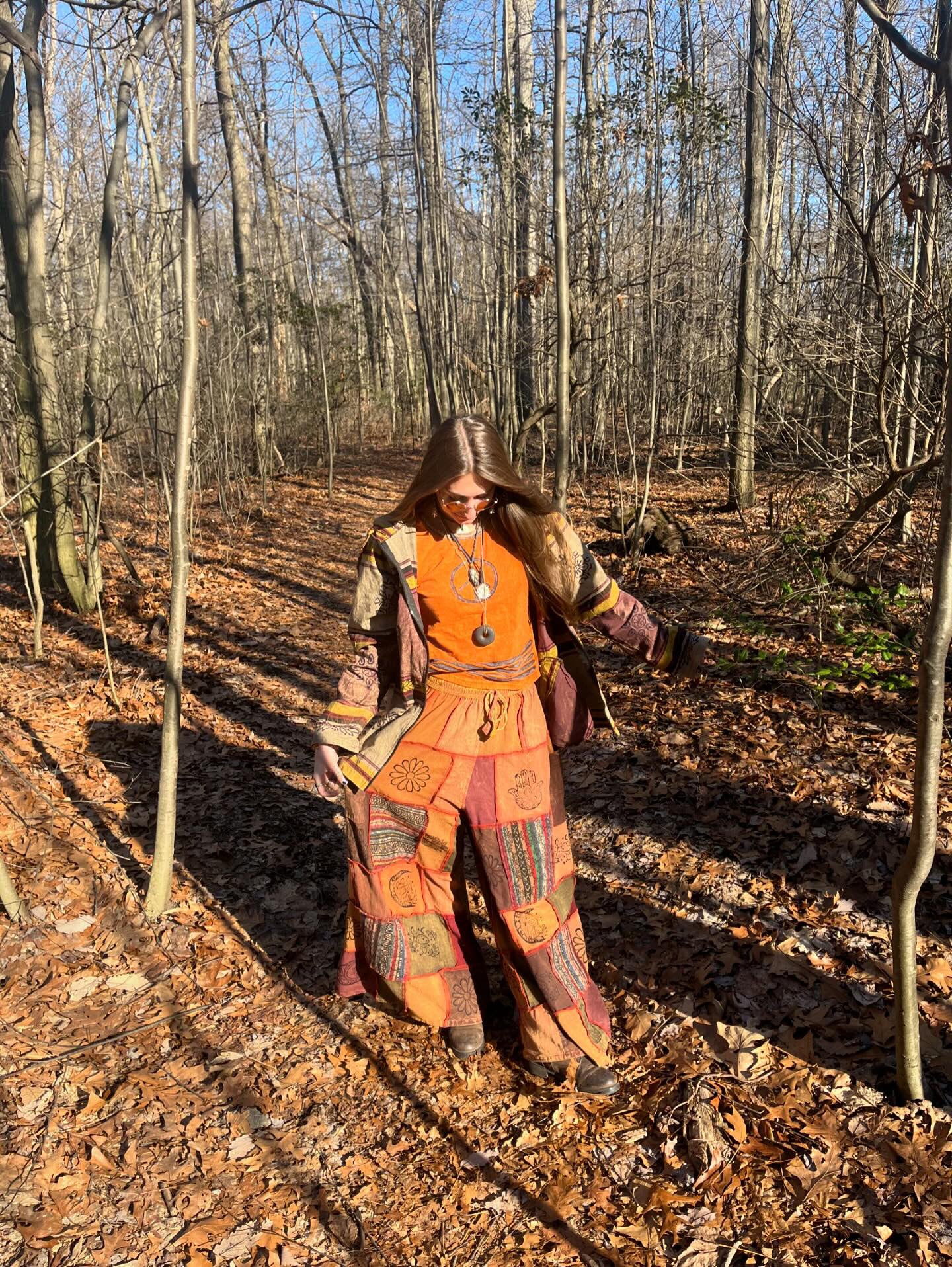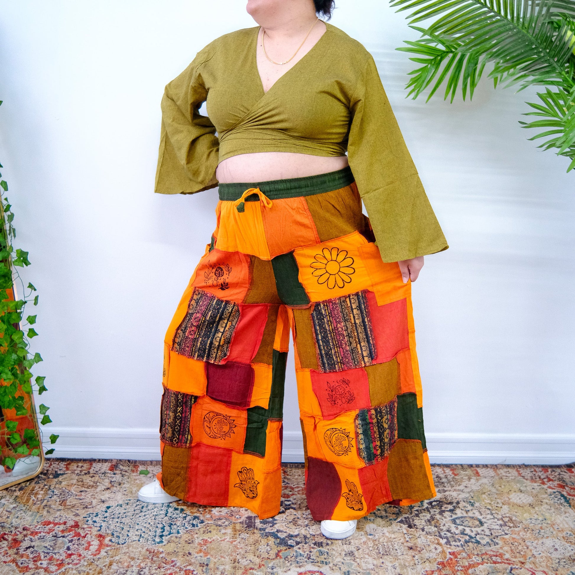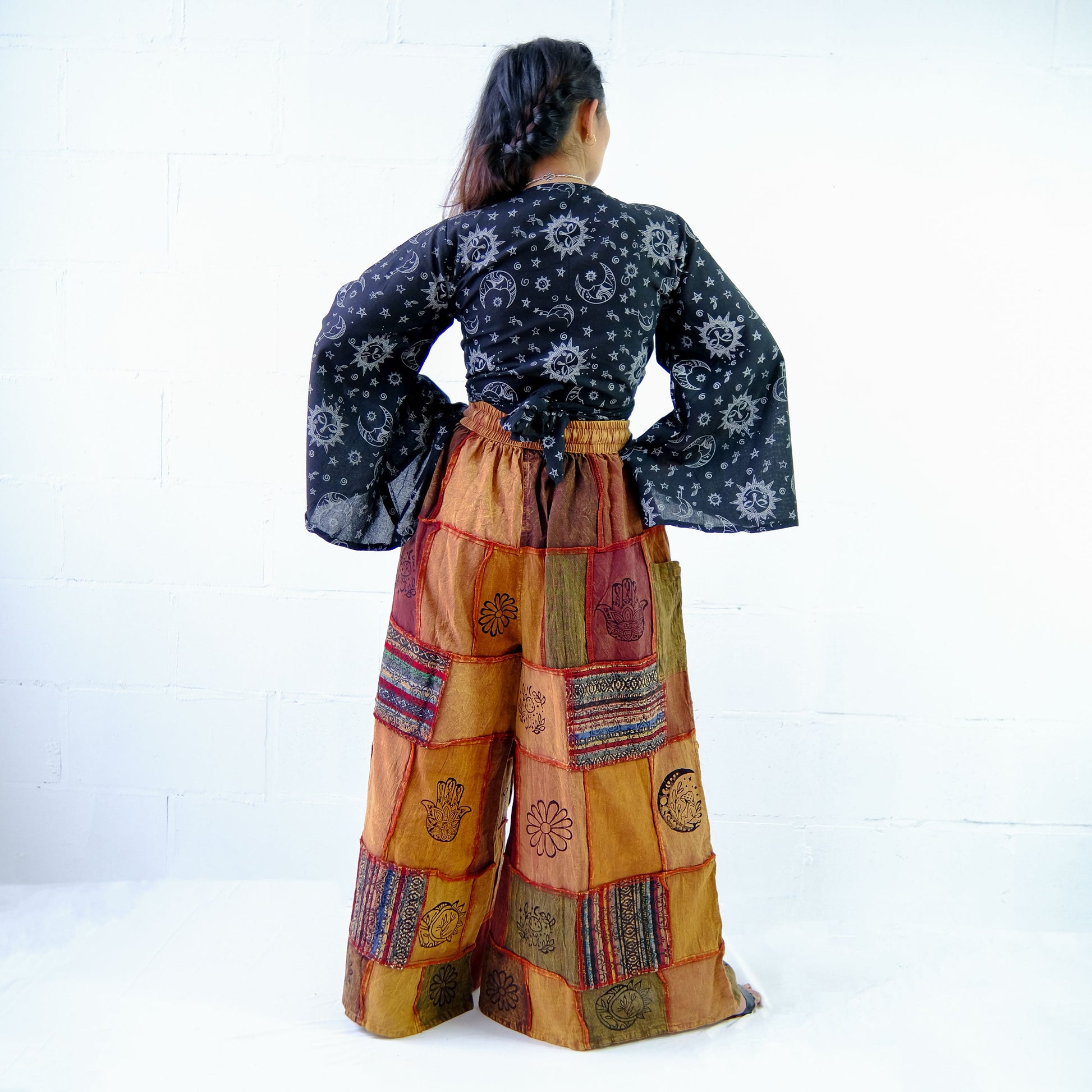 Introducing our Whimsigoth Inspired Patchwork Wide Leg Pants, handwoven with a celestial design! These 90s inspired trousers feature a unique patchwork style, perfect for the bohemian or hippie fashion lover. Made for all seasons, these unisex pants are inclusive of plus sizes and perfect for festivals.