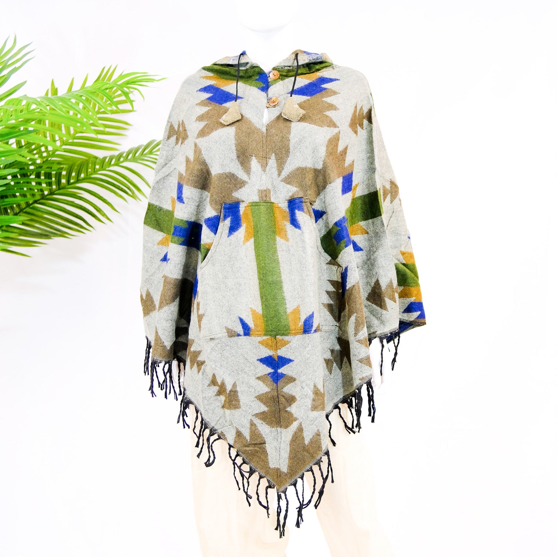 Stay cozy this fall and winter with this handmade wool blend pull over. Made with a mix of wool and soft materials, this hooded poncho is non-itchy, warm, and comfortable. The versatile unisex style can be worn as a wrap and features pockets to store phones and other things